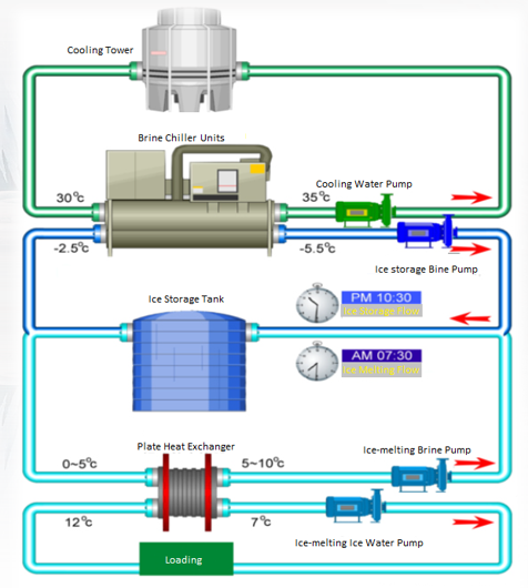 Ice storage system consists of water chilling unit, cooling tower, heat exchanger, water pump, ice storage device and control system etc.